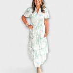 Predstavljamo Elizo | Klasična maxi obleka s potiskom – Vaš popoln spremljevalec za pomladne dni in vrtne zabave! Ta brezčasni kos brez truda združuje eleganten videz z maksimalnim udobjem in ima osupljiv zeleni in bel potisk, ki izžareva klasični romantizem.