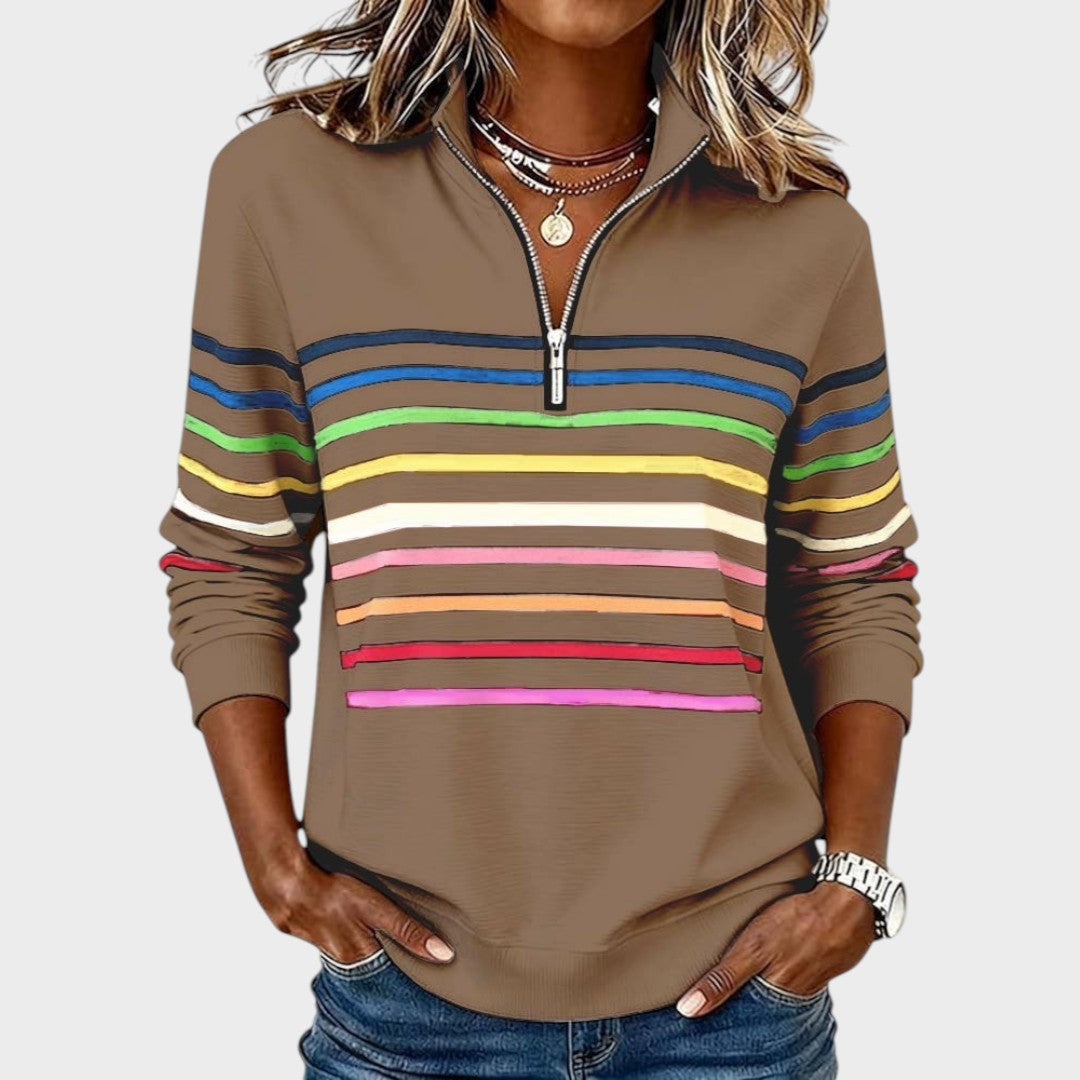 Nina je pulover z dolgimi rokavi in visokim ovratnikom s kratko zadrgo, ki združuje udobje in modernost. Njena horizontalna črtna zasnova prinaša svež in sodoben videz, hkrati pa ostaja preprosta in elegantna. Mehka tkanina in sproščen kroj zagotavljata prijetno nošenje, kar jo naredi idealno za vsakodnevne priložnosti. Zadrga omogoča enostavno prilagajanje ovratnika, kar povečuje udobje pri nošenju.