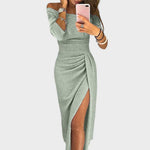 Ta maxi obleka s halterneck krojem združuje elegantno draperiranje in brezčasno silhueto. Z globokim izrezom in nabranim bodicem, ki poudari pas, se gladek material prilega telesu, medtem ko minimalistična zasnova brez hrbta doda sofisticiranost. Idealna je za večerne priložnosti.